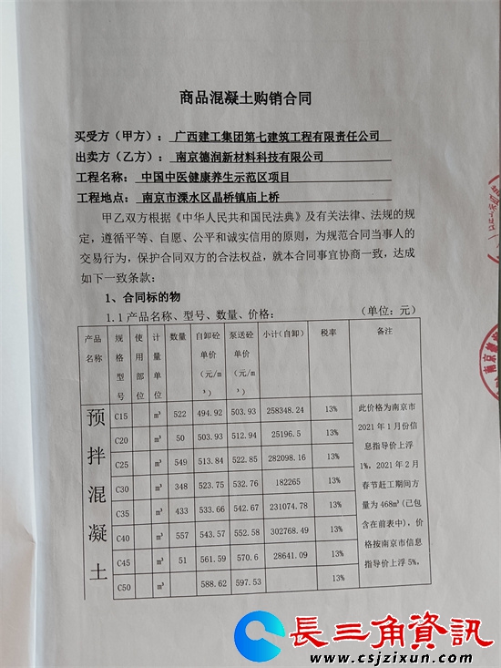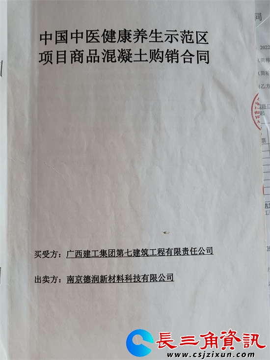 2021年1月25日,广西建工集团第七建筑工程有限责任公司作为买受方和出卖方南京德润新材料科技有限公司溧水分公司,签订了《中国中医健康养生示范区项目商品混凝土购销合同》。《合同》在合同标的物、质量标准、交货方式及时间、货物数量及质量的验收、付款方式和时间、税票要求、违约责任、争议解决及其他等方面具体约定。