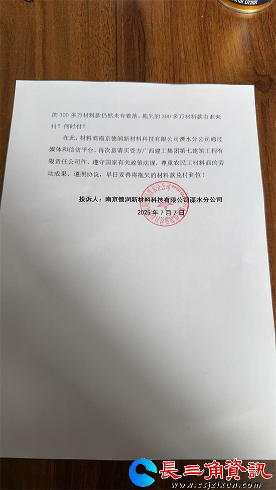 在此,材料商南京德润新材料科技有限公司溧水分公司通过媒体和信访平台,再次恳请买受方广西建工集团第七建筑工程有限责任公司遵守国家有关政策法规,尊重农民工材料商的劳动成果,遵照“购销合同”和“和解协议”,早日妥善将拖欠的材料款兑付到位!