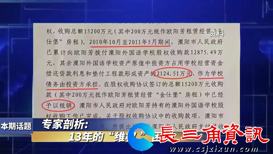 2010年,应江苏省人民政府办公厅关于进一步进行义务教育阶段改制学校清理规范工作的要求,民办非企业的溧阳外国语学校被划定在收购范围内。当年5月,溧阳市市政府成立了相关工作小组进行整体收购工作。经过整体商讨和清算,2010年7月22日,溧阳市人民政府与欧阳芳签订了《溧阳市人民政府收购欧阳芳持有的溧阳外国语学校股权协议书》,其中约定,溧阳市人民政府以股权收购形式溢价收购投资方欧阳芳所持有的全部学校股权,收购价格依据资产原值1.2亿余元,同时按银行贷款利率补贴财务费用,收购总额定为1.52亿元。其中政府实际支付1.5亿元,剩余200万元抵作欧阳芳租赁经营房屋的房租。其次,股权收购基准日为2010年6月30日,在该日期之前,溧阳外国语学校的原建设和运行中形成的一切债务仍由欧阳芳负责。欧阳芳在签约时,需提供溧阳外国语学校的详细债务清单,并承诺对遗漏债务及相关费用负全责。协议最后双方约定,在最后一笔收购款支付前,欧阳芳必须确保清偿溧阳外国语学校的所有债务。