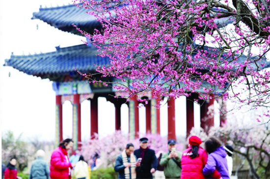 园内步道上游人如织,不少市民举着手机定格春光。“趁着天气好,带孙子来看看花,也给他拍几张照片留个纪念。”正在花树下为孩子拍照的市民李女士笑着说,“梅花还没完全谢,樱花又开了,一次能看到两种花,很难得。”