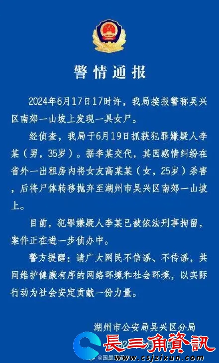 长三角资讯 湖州市公安局吴兴区分局通报,6月17日17时许,该局接报警称吴兴区南郊一山坡上发现一具女尸。 经侦查,警方于6月19日抓获犯罪嫌疑人李某(男,35岁)。据李某交代,其因感情纠纷在省外一出租房内将女友高某某(女,25岁)杀害,后将尸体转移抛弃至湖州市吴兴区南郊一山坡上。 目前,犯罪嫌疑人李某已被依法刑事拘留,案件正在进一步侦办中。