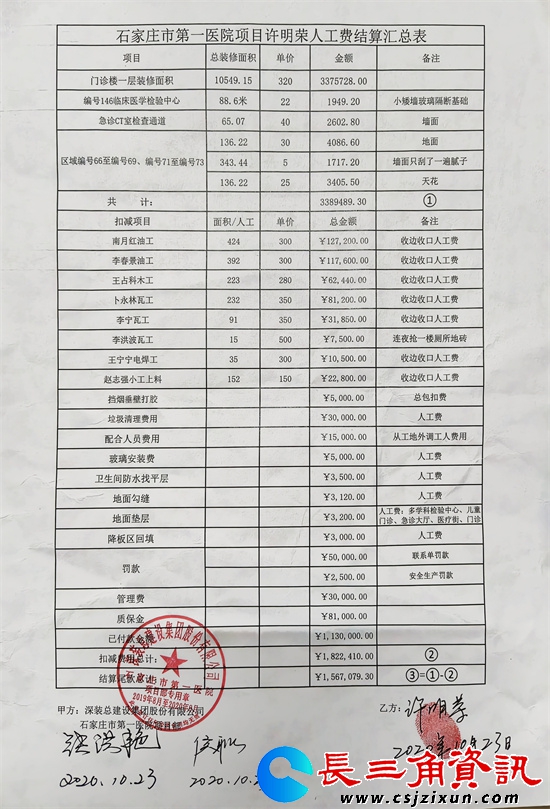 2019年9月,远在江苏省句容市的许明荣带领70多名农民工班组,承接了由河北建工集团有限公司(简称河北建工)负责的河北省石家庄市第一医院门诊楼一层干室内精装修任务(施工地点:石家庄裕华区南大街与裕泰路交汇处365号)。该施工任务于2020年4月28日竣工。同年,6月30日已投入使用。农民工工资总计3389489.30元,然而期间总包单位建工集团有限责任公司作为工资代发机构,只结付了113万的农民工工资,项目部却以各种理由扣减了692410.00元的费用,并且仍有1567079.30元农民工工资至今一直未予兑付。