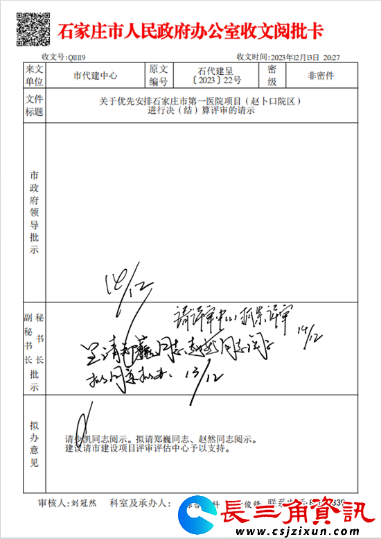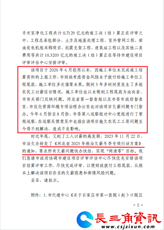自2020年4月份以来,一晃就是几年。一次次欺骗,一次次忽悠,让农民工们彻底寒心,也迫于无奈,于是农民工向国家信访局、河北省信访局、石家庄市信访局等有关部门开始反映农民工工资没有解决情况。时间一晃就来到了2023年12月,石家庄市政府投资项目代建中心发文,向石家庄市政府“关于优先安排石家庄市第一医院项目(赵卜口院区)进行决(结)算评审的请示”,恳请市政府协调市建设项目评审评估中心尽快优先安排该项目结算评审工作,尽快完成评审,以便财政拨付工程尾款,从根本上解决该项目存在的欠薪隐患和舆情风险问题。得到的批复中明确要求:所有欠薪问题快办快结,实现“两清零”目标。