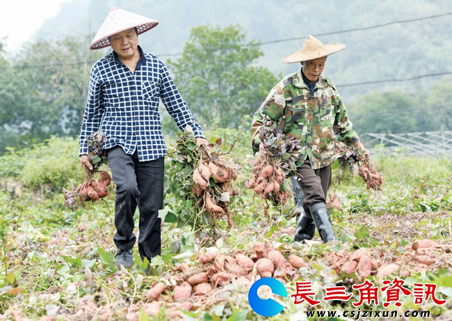 长三角资讯 10月9日,金华市武义县俞源乡后陶村“共富薯田”里,村民们正忙着收获“普2”和“徐薯48”小香薯。