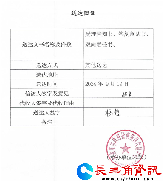 五、关于你们信访中提到8月23日进行答复,直到9月19日,才回复,已早过时限。信访事项办理双向责任书无签订时间,本人从未见到过,更谈不上送达。未曾见到过此送达回证,何来所谓的“拒签”?