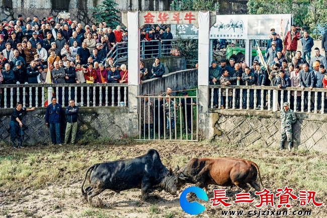 长三角资讯 11月26日,金华市婺城区雅畈镇铜山斗牛场热闹起来,这是2024年最后一场斗牛活动,吸引了不少市民前来观看。在锣鼓声和呐喊声中,两头黄牯牛四角相抵、奋力争斗,让观众大饱眼福。(楼冀阳、陈业)