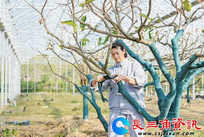 长三角资讯 近日,在金华市金东区岭下镇的一家农业科技产业园,员工们给大棚内种植的莲雾、树葡萄、芭乐、杨桃、仙桃等热带水果树干包上专用保鲜膜和保温毯,提前做好冬季果树防冻保温工作。(时宽兵)