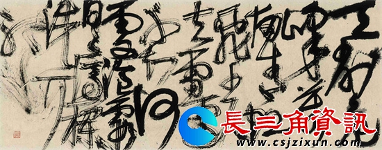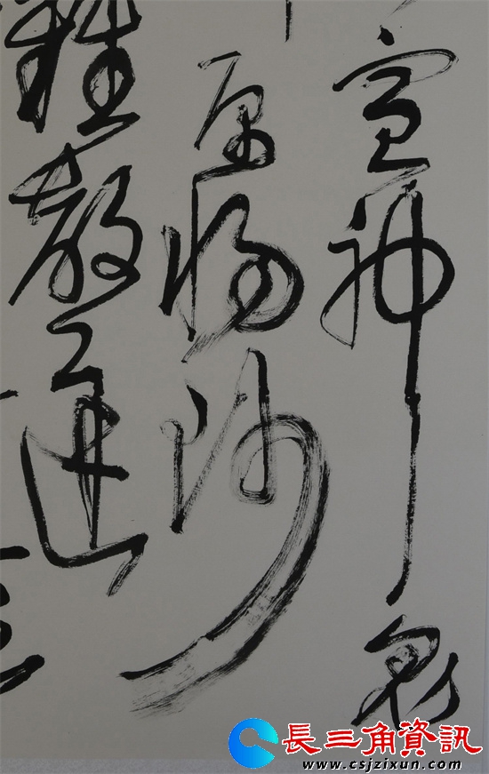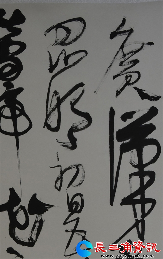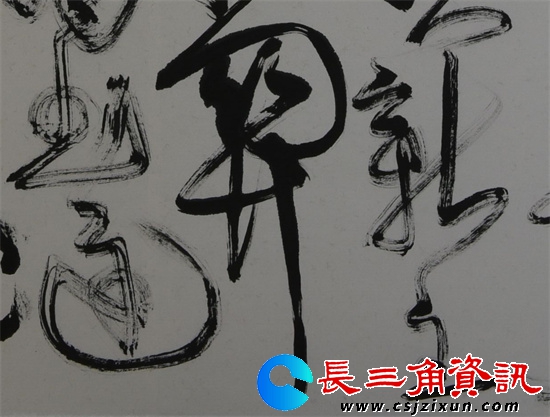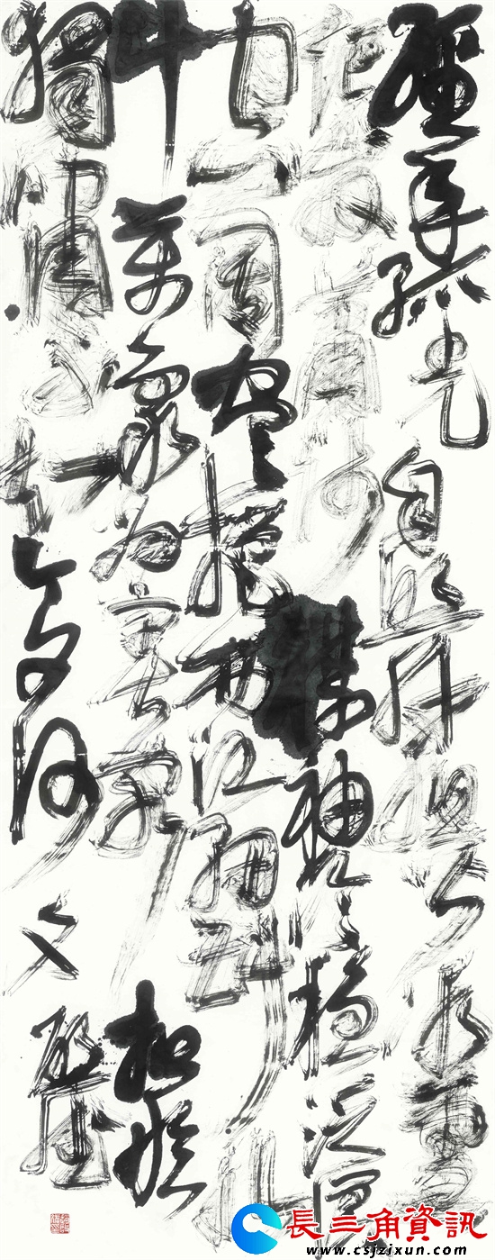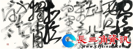 二、赵启斌书法艺术创作过程的形成与发展。赵启斌的书法创作过程本身就是一种艺术。在书法创作中他非常注重使用优质的工具,如特制的长锋笔和上等的纸张,讲究材料与艺术创作的互动关系和表现效果。这些工具的选择不仅体现了他对书法艺术的尊重,也是他的书法艺术作品质量得以保证的重要手段。他的这一不计工本的投入意识和对材料的高度重视,也进一步激发出他创作的热忱和更高的艺术目标的追求,确实相得益彰。在进行创作时,赵启斌多采用宿墨快写,往往一笔写到枯墨线才肯罢休,这种技巧不仅考验着书法家的控笔能力,更是一种对墨色变化的极致追求,使笔下呈现出难以预料的丰富的变化。随后,他再逐渐放慢笔速,连续书写两三字或五六字后再重新蘸墨推进,这样的节奏变化使得作品呈现出强烈的动感和生命力,造成具有抽象意义的画面,具有精神性、表现性的审美空间随之出现,书法艺术所具有的创造性、原创性特质被得以充分地发挥出来。赵启斌书法艺术创作过程就是一种艺术结构的生成、审美境象的创立和开拓的过程。