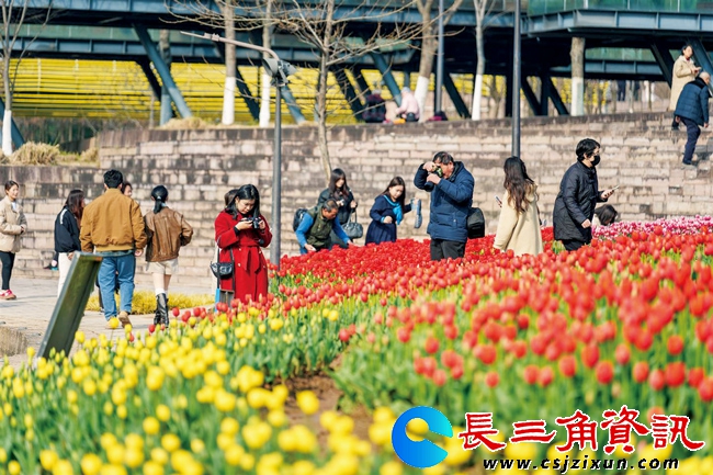 长三角资讯 2月26日,在金华市区燕尾洲公园,五颜六色的郁金香竞相开放,整齐地排列着,美感十足。
