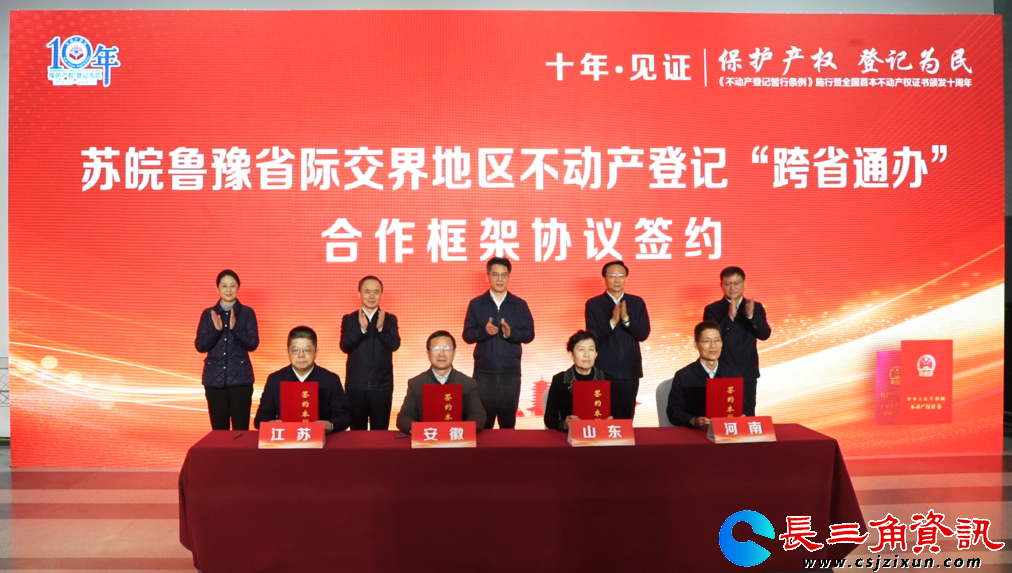 2025年3月1日,《不动产登记暂行条例》施行暨全国首本不动产权证书颁发十周年。在首证颁发地江苏省徐州市举办的现场活动上,苏皖鲁豫省际交界地区合作再扩容,四省十市正式签订框架协议,启动不动产登记“跨省通办”合作。