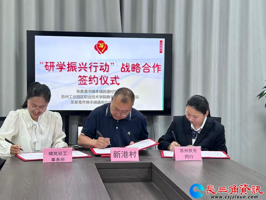苏南早报讯 15日,由苏州张家港市新港村村民委员会、锦丰镇晴岚社会工作事务所,以及苏州工业园区职业技术学院“扶光同行”团队,共同发起的“研学振兴行动战略合作项目”正式签约。