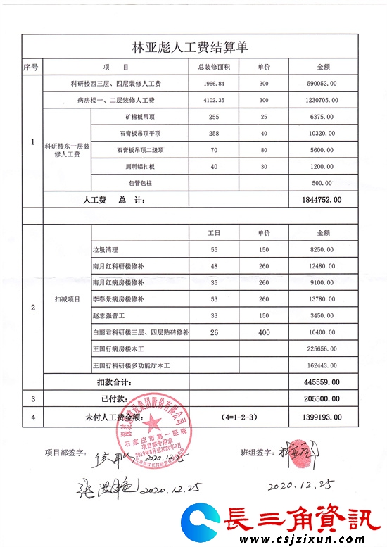 石家庄市第一医院石家庄裕华区南大街与裕泰路交汇处365号(赵卜口院区),是石家庄政府投资项目,建设单位为石家庄市政府投资项目代建中心,施工总承包单位为河北建工集团有限责任公司(简称河北建工)。2019年9月,深装总建设集团股份有限公司(简称深装总建)分包河北省石家庄市第一医院门诊楼施工项目,林亚彪班组48人负责石家庄第一医院(赵卜口院区)科研楼西三层、四层及病房楼一层、二层装修工程施工任务。蹊跷的是,该工程于2020年6月30日前完结,建筑主体随即投入使用,而直到同年12月25日才给林亚彪班组出具“人工费结算单”。
