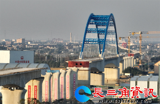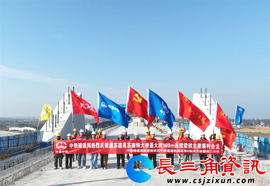 长三角资讯 11月23日,由沪杭公司建设、中铁隧道局集团承建的通苏嘉甬高铁江苏段首座最大跨度连续梁拱组合桥——苏南特大桥跨白蚬江连续梁拱组合桥主跨顺利合龙,打通了14公里的重要架桥机通道,标志着通苏嘉甬铁路建设取得关键胜利,为长三角南北向骨干通道、苏州“丰”字形国家干线铁路网的南北主动脉建设注入强劲动能。