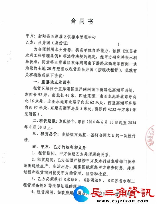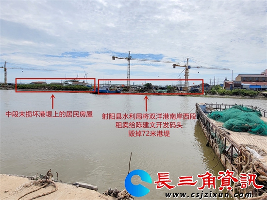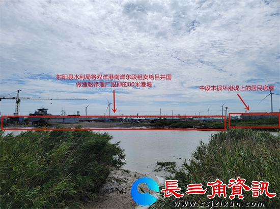 陈立飞总经理向媒体介绍道,企业北边 100 米的双洋渔港港堤是重要防护屏障。从有双洋渔港起至今,一直都有港堤防护海水侵蚀,港堤上也一直有渔民居住至今。2012 年,射阳县水利局将港堤西段 72 米租给临海镇居民陈建文 20 年,租金 11 万元,承租人将港堤降近 2 米至地平面以下开发成码头。企业提出质疑遭时任县水利局五岸灌区进排水管理中心主任丁中兵无视。2014 年,丁中兵又将企业对面 92 米港堤租给吕井国开发渔船修造厂,租期 20 年,租金 17 万元,港堤被降近 2 米推平。
