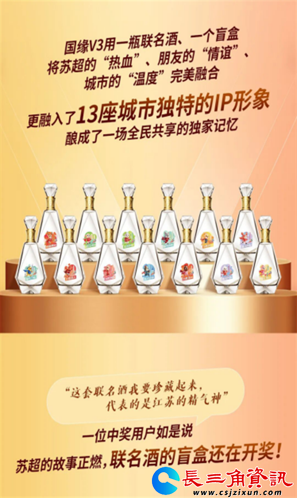 “苏超”总决赛在即,国缘V3又以一种意想不到的方式火爆出圈,见证荣耀,致敬胜利。推出最炫文创产品——“国缘V3·苏超”联名酒,一鸣惊人,成为了全民争抢的焦点。国缘V3没走硬广套路,反倒把江苏 “十三太保”的城市地标、球队元素印在瓶身上,南京的紫峰大厦、淮安的小龙虾全成了酒瓶上的彩蛋,球迷喝的是酒,更是家乡情怀。江苏“十三太保”激情上演绿茵聚缘,输赢都是英豪。“国缘V3·苏超”联名酒,不为一城独耀,更为十三城热爱共情,为十三个城市量身打造独特的文化符合,承载城市文化和地方乡情的城市IP。