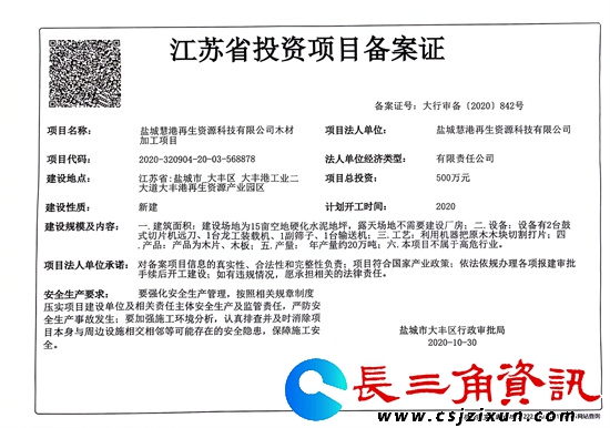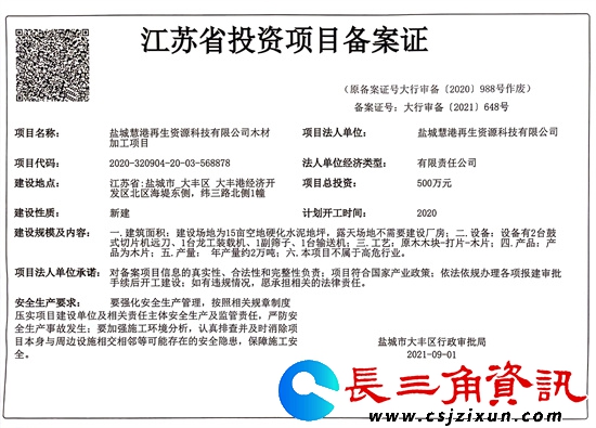 2.公司随后通过申请,在2020年10月30日取得盐城市大丰区行政审批局的投资项目备案证(备案证号:大行审备【2020】842号),项目名称为盐城慧港再生资源科技有限公司木材加工项目。