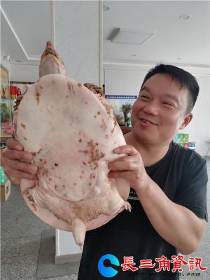 长三角资讯 4月10日上午,在镇江宝堰通济河边,一只大甲鱼爬到岸边草丛中,正在钓鱼的镇江宝堰小伙子雍刚发现后猛冲上前将大甲鱼翻了过来,雍刚踩着甲鱼心惊胆战,既怕大甲鱼咬到自己,又怕大甲鱼挣脱跑掉,情急之下雍刚连忙叫了几个正在路过的行人,几个人七手八脚将甲鱼弄到路上用箱子装了起来,回家一称竟有14斤8两。