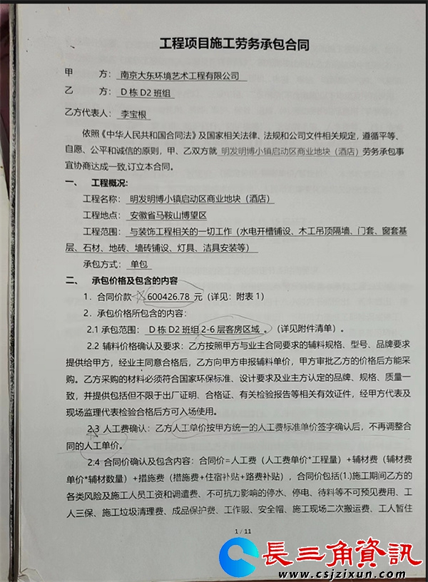 2020年8月10日,安徽省马鞍山博望区明发明博小镇启动区商业地块(即马鞍山明发国际大酒店)项目开始启动。总承包方南京大东环境艺术工程有限公司(简称南京大东)(甲方)与D栋D2班组(乙方代表人为李宝根,工程实际施工负责人为曹孝杰)签订《工程项目施工劳务承包合同》。施工地点位于安徽省马鞍山博望区。