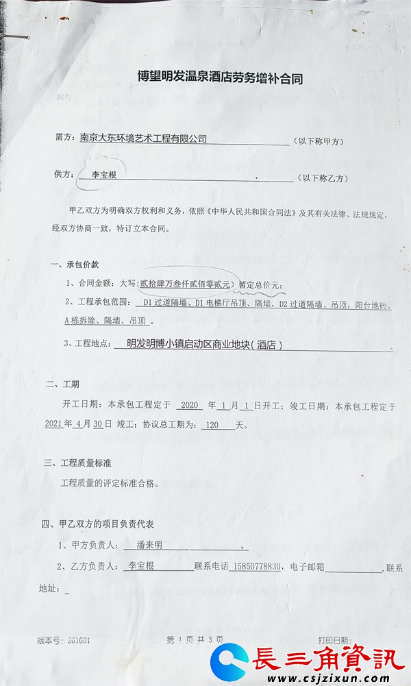 后因甲方需求,附加额外工程量,甲乙双方了签订《博望明发温泉酒店劳务增补合同》,双方约定增量工程于2021年1月1日动工,4月30日竣工,工期120天,暂定总价为24万多元。