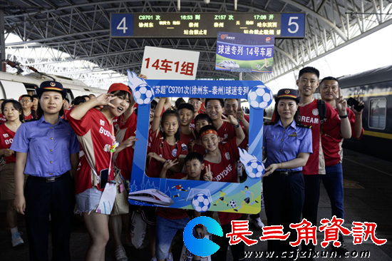 6月29日,球迷乘坐C9701次球迷专列到达江苏泰州站后合影。新华社专门发了图片新闻。