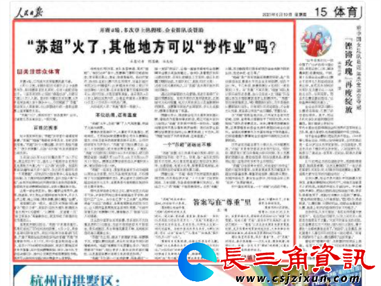 《人民日报》大篇幅、多角度报道连续“苏超”战况。还在体育版头条刊登深度报道《“苏超”火了,其他地方可以“抄作业”吗?》,在全国引起强烈反响。他们在一篇题为《“苏超”能火多久》的述评中指出:“苏超”热度不亚于收官季的欧洲各大顶级联赛。“苏超”何以爆火?火在真实,还火在真诚,更火在相互激励。从“村超”到“苏超”,让亿万人民在体育强国建设中共享福祉。
