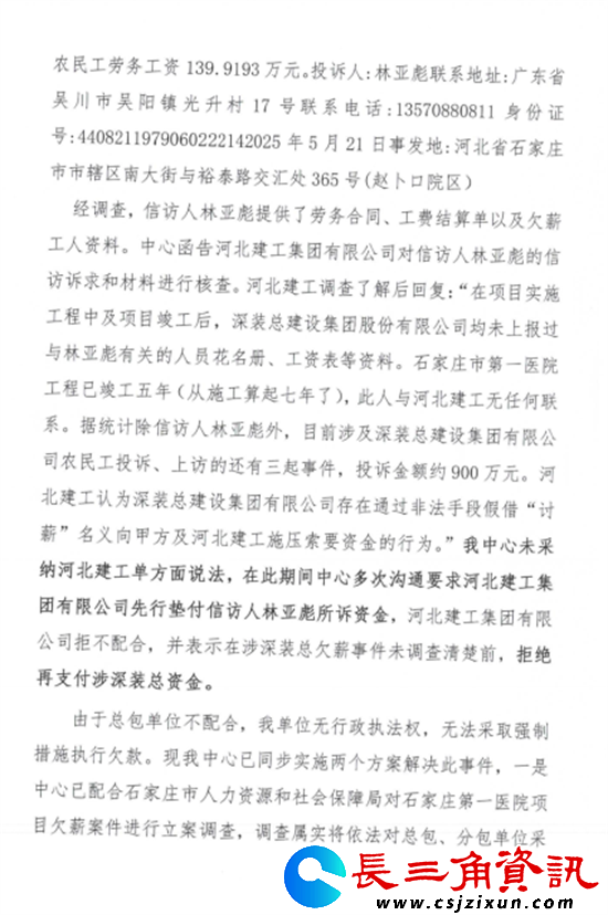 长三角资讯 石家庄市第一医院项目(赵卜口院区)是石家庄政府投资项目,建设单位为石家庄市政府投资项目代建中心,现更名为石家庄市城市更新促进中心,施工总承包单位为河北建工集团有限责任公司。然而该项目自开工至今7年了,拖欠来自广东省深圳林亚彪班组等农民工劳务工资139.9193万元仍未支付。