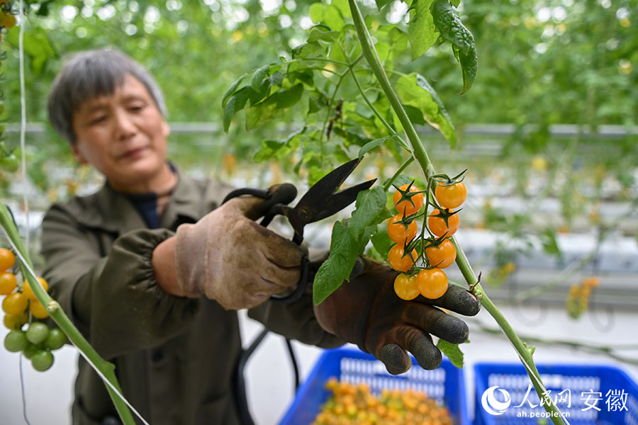 长三角资讯 2月16日,在安徽凤台县州来绿港智慧农业产业园里,园区工作人员正在采摘成熟的瓜果蔬菜准备上市。