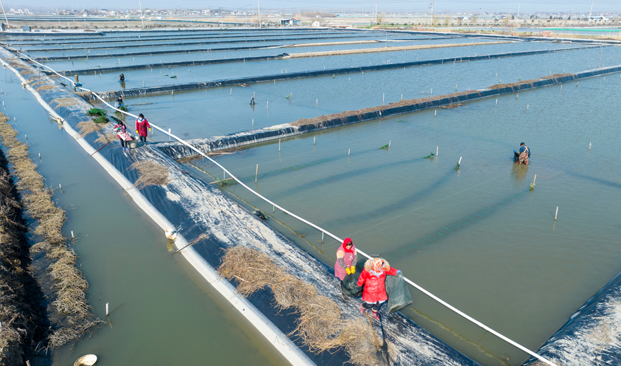 江苏兴化:万亩蟹塘水上“春耕”忙