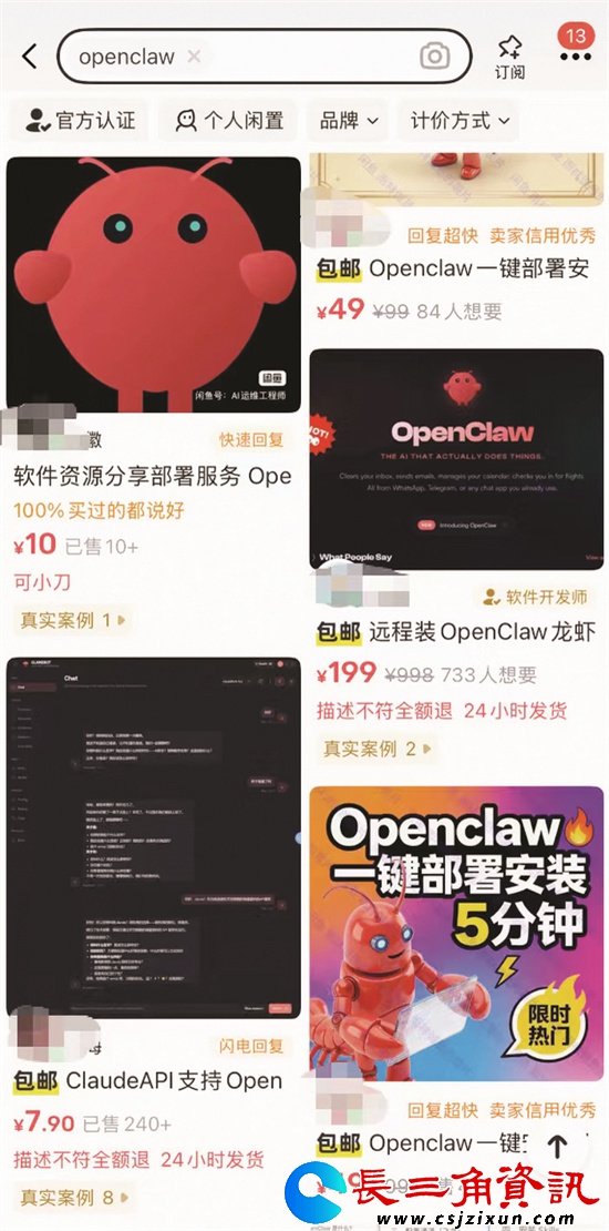 扬子晚报/紫牛新闻记者在闲鱼平台检索发现,与OpenClaw相关的代安装商家已有数百家,报价从十元、几十元到数百元、上千元不等,价格差距很大。低价服务多以“基础安装”“远程指导”为主,价格较高的则主打“全套部署”“环境配置”“后续维护”等一条龙服务。