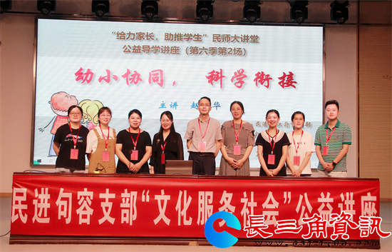幼小衔接是指幼儿园与小学两个教育阶段平稳过渡的教育过程,为了使家长对“幼小衔接”有个全面的了解和正确的认识,帮助孩子实现从幼儿园到小学阶段教育的顺利过渡。民师大讲堂特邀民进镇江句容支部会员、句容市崇明小学教科室副主任、中小学高级教师赵荣华,开展《幼小协同,科学衔接》专题讲座。