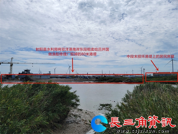 2012 年,射阳县水利局将港堤西段 72 米租给临海镇居民陈建文 20 年,租金 11 万元,承租人将港堤降近 2 米至地平面以下开发成码头。企业提出质疑遭时任县水利局五岸灌区进排水管理中心主任丁中兵无视。2014 年,丁中兵又将企业对面 92 米港堤租给吕井国开发渔船修造厂,租期 20 年,租金 17 万元,港堤被降近 2 米推平。