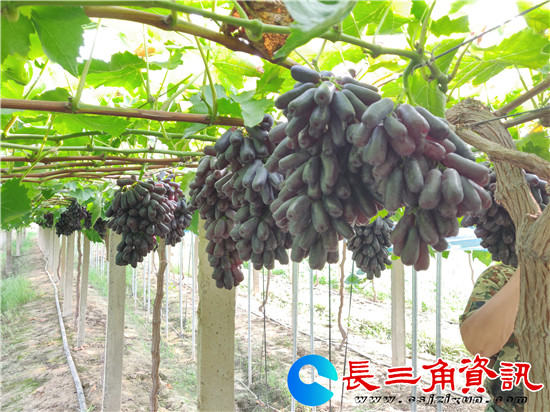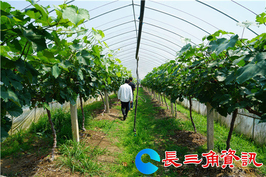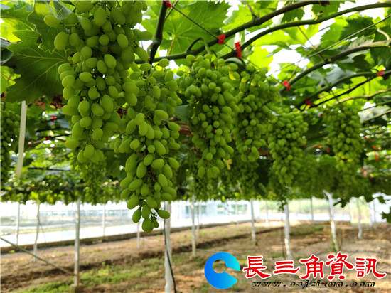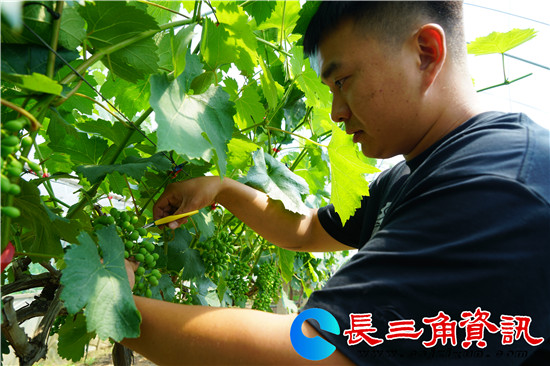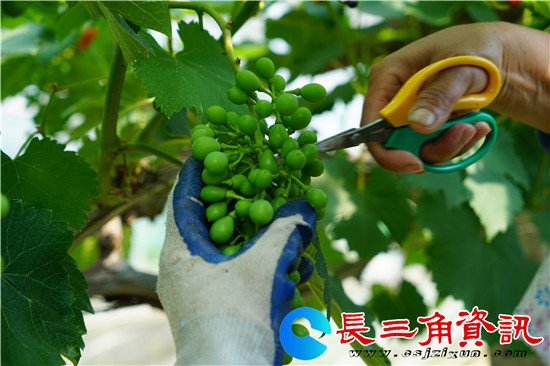 长三角资讯 五月,正值葡萄疏果高峰。日前,记者在地处句容后白镇泗庄村、机场大道旁的镇江青禾生态园大棚内看到,种植户高靖和员工们正在修剪葡萄树上过密的枝条,保证每串葡萄光线养分充足,提高葡萄品质。只见葡萄新枝蜿蜒伸展开来,枝头挂出一串串葡萄颗粒,青绿如玉,长势喜人,预计七月初新鲜葡萄面市。