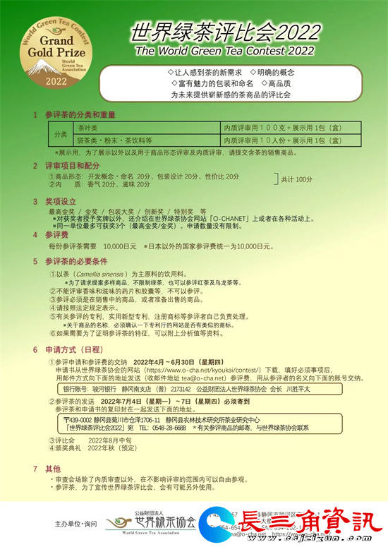 据了解,世界绿茶协会是日本静冈县政府成立的一个组织,旨在通过传播绿茶的传统和对其健康及商业特性的了解,进一步发展绿茶生产、文化和理念。会上有来自中国、日本、韩国等主要产茶国或地区的茶企茶品参评,审评专家团也是跨国组成,除重点考察茶的生长环境、工艺、外形、内质香气和口感等传统评选项目外,还从开发理念、命名、包装设计等方面进行严格审评,其影响程度堪称绿茶界的“奥斯卡”。