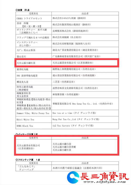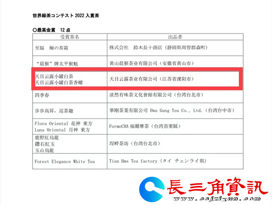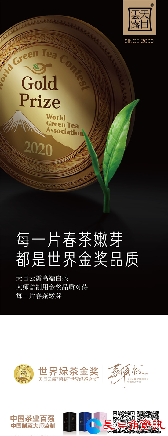 长三角资讯 近日,从日本评审现场传来喜报,世界绿茶最高级别评选活动之一的“2022世界绿茶评比会”评选结果揭晓,由江苏天目云露茶业有限公司出品的茶叶从世界各地95只送审参评绿茶中脱颖而出,揽获包含“最高金奖”在内的多个重磅奖项。三次参评,三次获奖!自2020年以来,天目云露品牌茶叶已经连续3年斩获世界绿茶评比会金奖,成为省内唯一一家“世界级金奖专业户”。这意味着,天目云露品质已然跻身世界一流水准,代表中国赢得世界级认可!