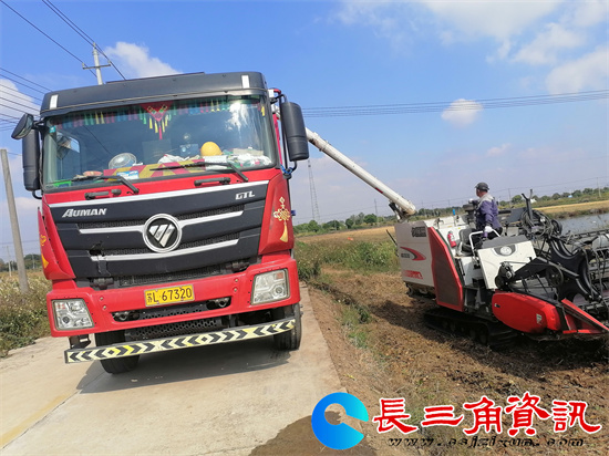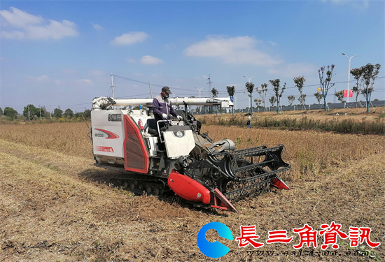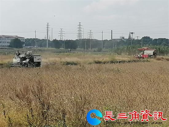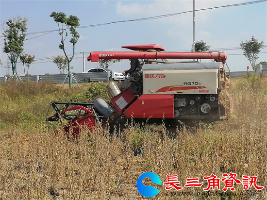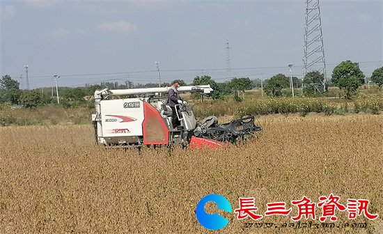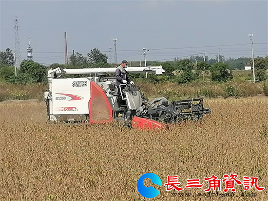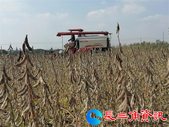 长三角资讯 10月15日上午,镇江宝堰800多的大豆基地里,几台收割机正在来回穿梭,抢抓晴好天气抢收刚刚丰收成熟的大豆。