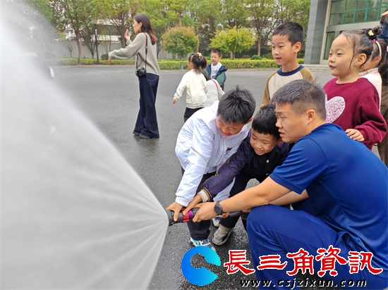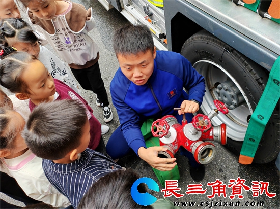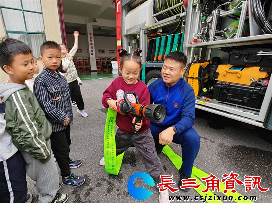 讲解员殷俊肖耐心地给孩子们介绍了泡沫消防车、多功能抢险消防车的功能和使用场景,并带领孩子们体验了战斗服穿戴和消防水枪的使用。