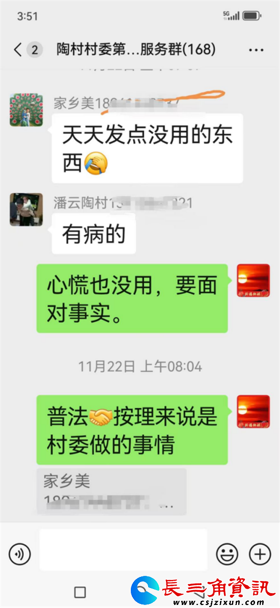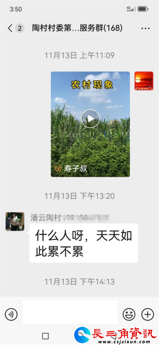 长三角资讯讯 最近,家住溧阳市上兴镇陶村村委江下村、平时长年在外承揽工程的村民周阿富遇到“揪心事”:只因自己平时非常注重学习,关注国内外时事、法律知识和民事纠纷,以及村级经济发展好思路好做法,闲暇之余,便将一些有利于村民普法和村级经济发展的典型小视频转发到村网格群,但,此举不仅惹来村委一些干部和少数村民的奚落,说他“显摆逞能”“什么都懂似的”,甚至遭到村党支部副书记潘云的公开责骂。潘云不仅在群里责骂他“有病的”,还扬言,继续发小视频,就把他“踢出群”去。