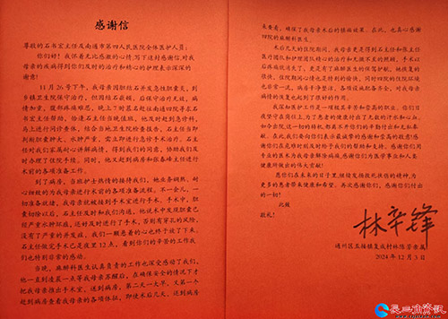 长三角资讯讯 12月3日,南通市通州区五接镇复成村林陈芳老人的家属向南通市第四人民医院发来一封饱含深情的感谢信,对医院在林陈芳老人突发胆囊疾病时给予的及时救治和精心护理表达了诚挚谢意。