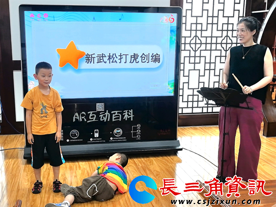 随后,孩子们轮流上台,手握京剧戏剧鼓,化身小小戏曲创作者。他们发挥奇思妙想,尝试创编独特的锣鼓节奏,时而轻敲慢打,时而激昂热烈,现场鼓声阵阵,充满了童真童趣。压轴大戏《武松打虎》掀起了全场热潮。孩子们有的扮演威风凛凛的武松,有的化身憨态可掬的老虎。在锣鼓点的配合下,一招一式虽显生涩,却充满童真童趣。台下观众时而为“武松”的英勇喝彩,时而被“老虎”的可爱模样逗得开怀大笑。
