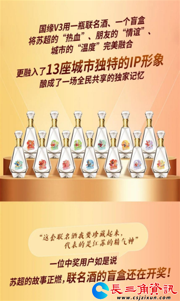 “国缘V3·苏超”联名酒一经推出,便火爆全网。“收藏记忆”成为广大球迷的追捧。“苏超”燃情出圈,引发的千万球迷狂欢、15亿粉丝围观,经历过的人,总想收藏一点珍贵的记忆。“国缘V3·苏超”联名酒 ,将苏超的“精神”、狂欢的“激情”、城市的“记忆”融入瓶中,以醉美的文化符号,留住永恒的瞬间。