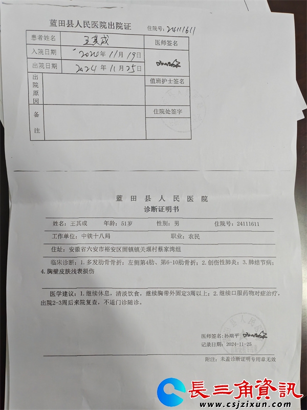 按理说,六根肋骨骨折,属于严重的安全事故,至少也要在医院住上一段时间,但施工方和医院方都督促王其成出院,回家疗养。甚至连医疗费都不肯出,让王其成在家疗养6个月后,到指定医院进行医疗鉴定后,再进行补偿或赔偿。所以,王其成万般无奈,不得不只在医院仅住了一周,就出院了。