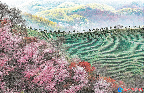 长三角资讯 3月8日,芜湖市繁昌区孙村镇水口村茶园樱花绽放,烂漫的花朵与翠绿的茶树相互映衬,构成如画美景,吸引众多游客前来观赏。通讯员 邢朝明 摄