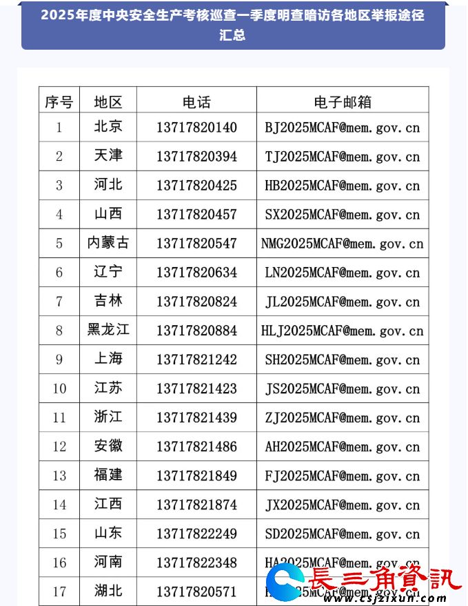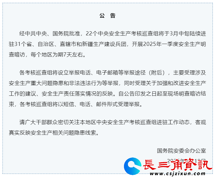 长三角资讯 记者19日从应急管理部获悉,2025年度中央安全生产考核巡查一季度安全生产明查暗访日前正式启动。由国务院安委会有关成员单位负责同志带队的22个中央安全生产考核巡查组陆续进驻31个省份和新疆生产建设兵团。