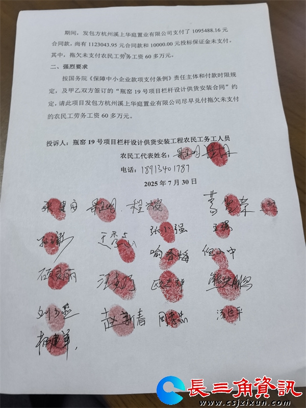 长三角资讯 近日,因浙江华元华昭府项目因未按合同约定支付承包方江苏固格澜栅公司工程款,导致下游农民工工资及材料供应商货款长期拖欠,农民工及供应商迫于生计压力,多次维权无果后,采取拉横幅、投诉至劳动监察部门、集体上访等方式表达诉求。事件引发广泛社会关注。