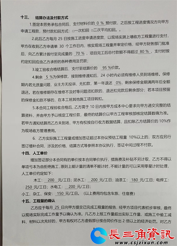 根据该承包合同,工程项目定于2020年8月15日动工,12月20日竣工,工期125天,原先工程估价60多万元。双方确定了施工价格和进度、质量标准、责任义务等施工的细节,特别明确了结算办法及付款方式:双方约定,签订劳务承包合同后,在零预付款的前提下,此后乙方每月25日按施工进度申请施工款,以现场实测上墙收方工程量进行支付,甲方在收到乙方申请单 30个工作日内,核实现场工程量并审定价格,经甲方财务部门批准后,向乙方累计拨付至完成量的70%,项目完工后总付款额不得超过80%。竣工验收合格结算后,支付至结算价的95%价款。剩余 5 %为保修款,接到维修通知后,24 小时内必须有维修人员到场维修。保修期两年内若无质量问题,业主方无投诉、无扣款,第一年退还0%,剩余保修金期满两年后全额退还。乙方实际施工工程量或增加签证超过本协议预估工程量 10%以上的,双方应另行签订增补合同,涉及的价格、结算方式等参照本协议执行,签证中间过程不付款。