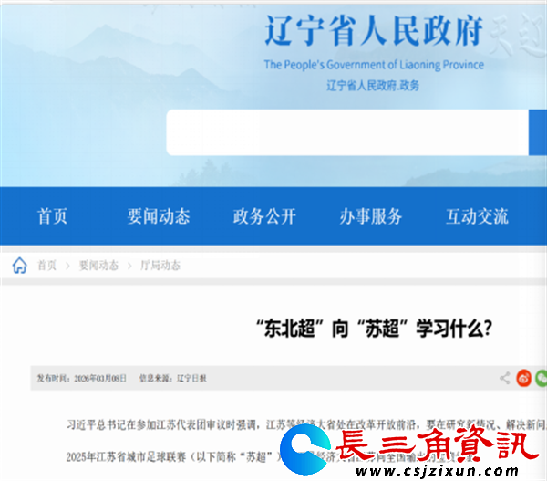 最近,辽宁省人民政府正在全省开展学“苏超”活动。辽宁省人民政府在官网上发表《“东北超”向“苏超”学习什么》文章指出:习近平总书记在参加江苏代表团审议时强调,江苏等经济大省处在改革开放前沿,要在研究新情况、解决新问题上下功夫、出经验。2025年江苏省城市足球联赛,正是经济大省江苏向全国输出的宝贵经验。